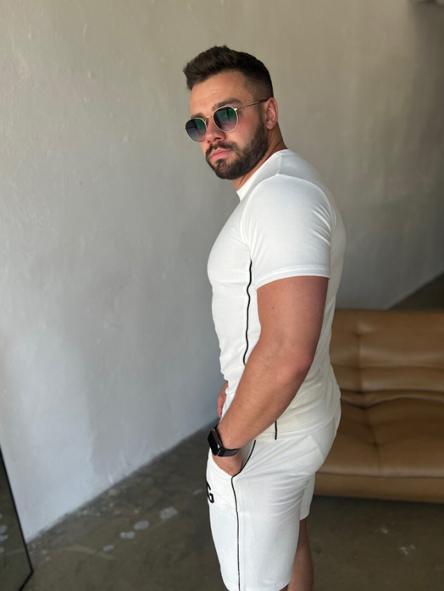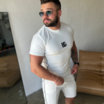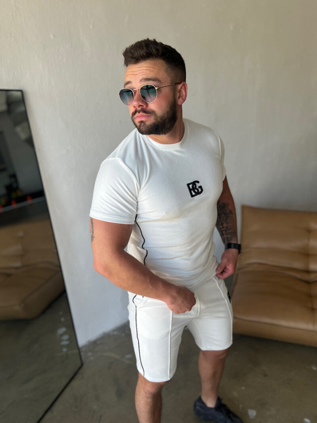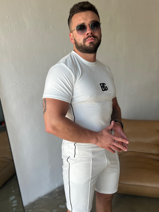 Must have w Twojej szafie! Welurowy komplet w kolorze białym. Na piersi oraz na nogawce znajduje się wyhaftowane logo marki BG w 3D. Szorty posiadają kieszenie, gumkę w pasie oraz sznurek do regulacji. Idealna propozycja na wiosnę/lato. Jakość PREIUM, Polska marka.