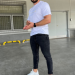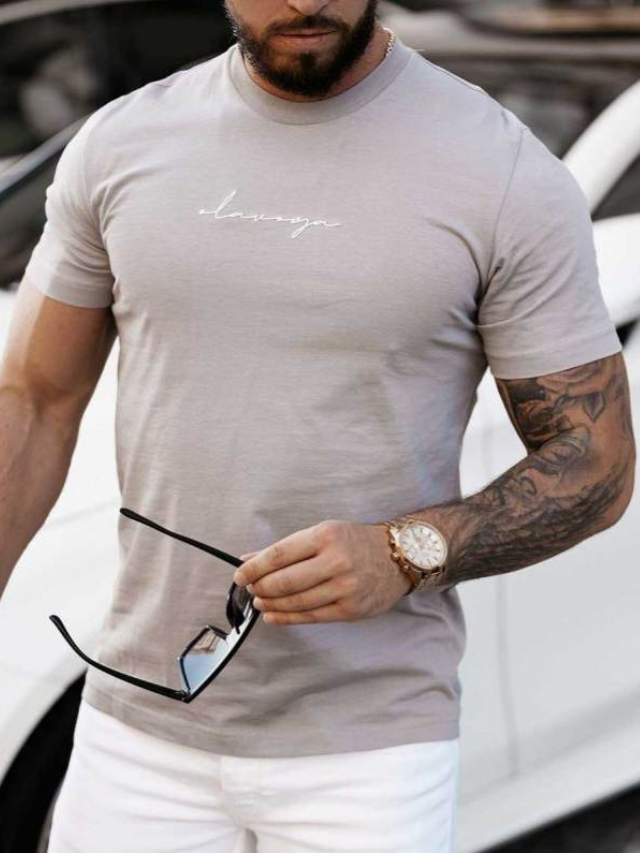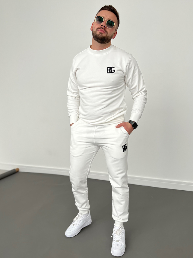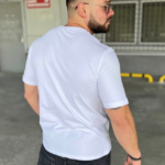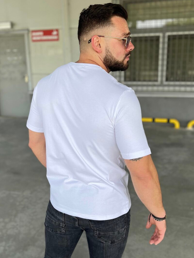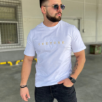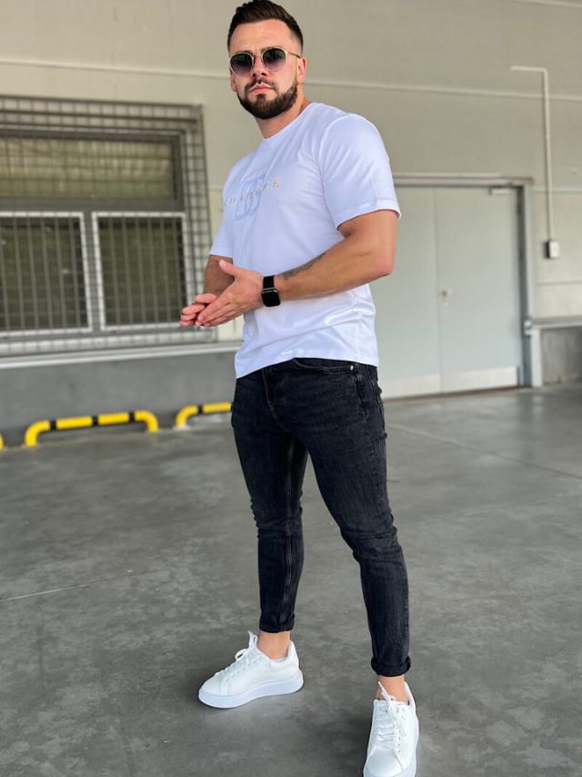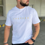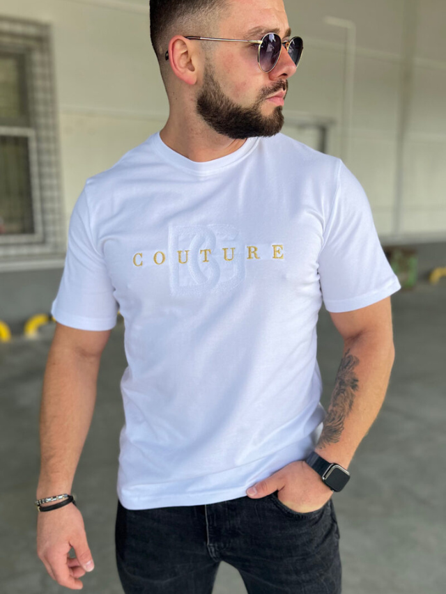 Klasyczny t-shirt w kolorze białym. Na środku duże wyhaftowane logo marki BRANDENBURG COUTURE (w kolorze złotym). Bawełniany, elastyczny materiał. Polska Marka PREMIUM.